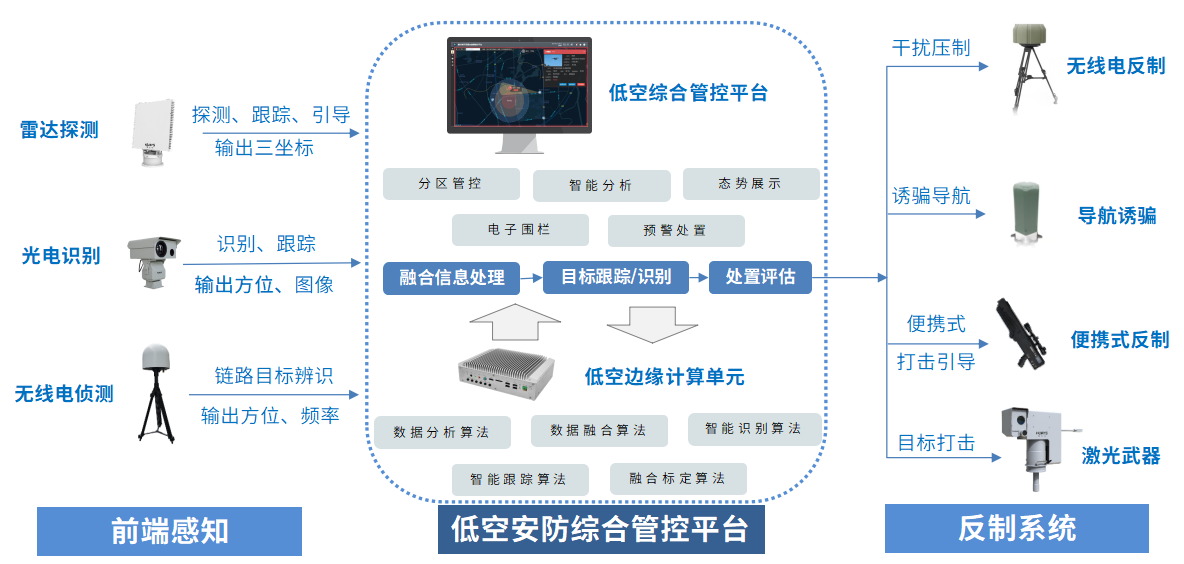 慧爾視“天羅3號”系統(tǒng)構建“遠、中、近”三層防御體系,并實現(xiàn)多元感知和多元打擊閉環(huán)方案。